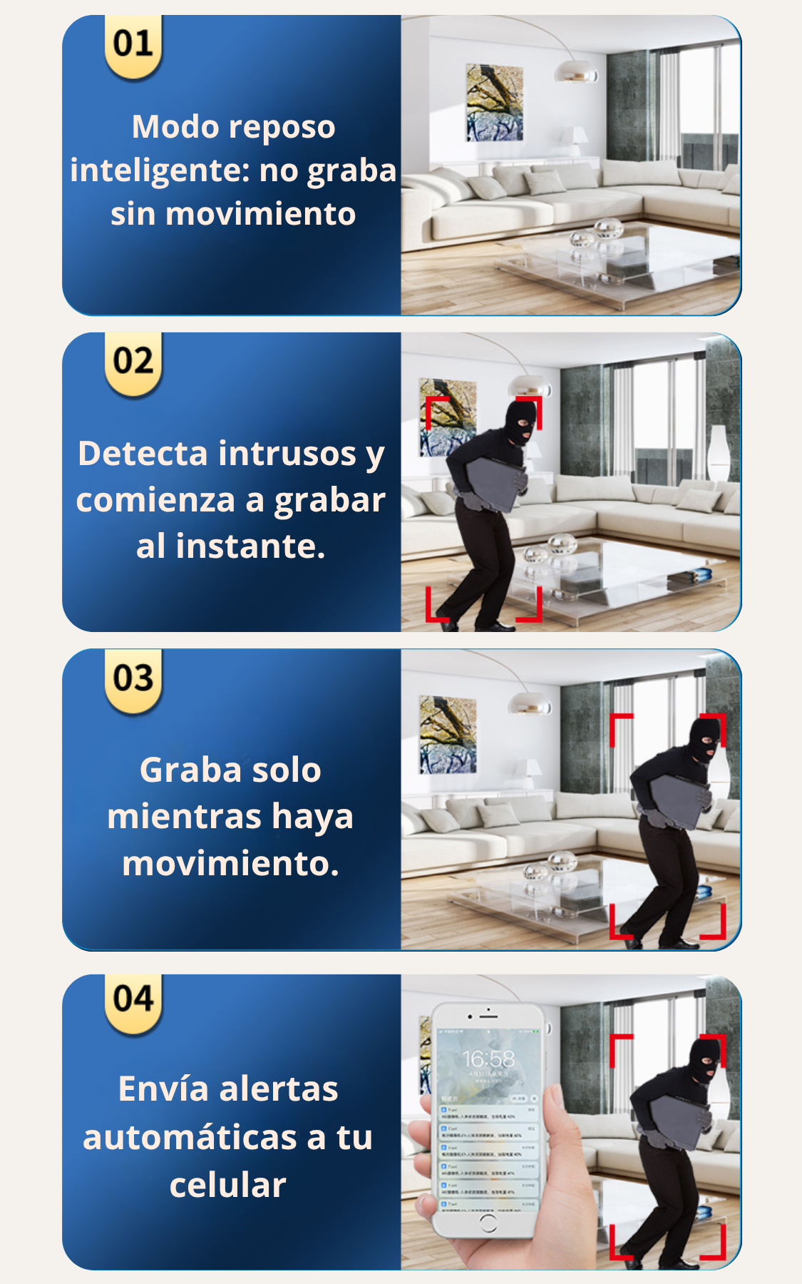 Con la detección de movimiento inteligente, solo graba cuando es necesario, optimizando energía y almacenamiento.
